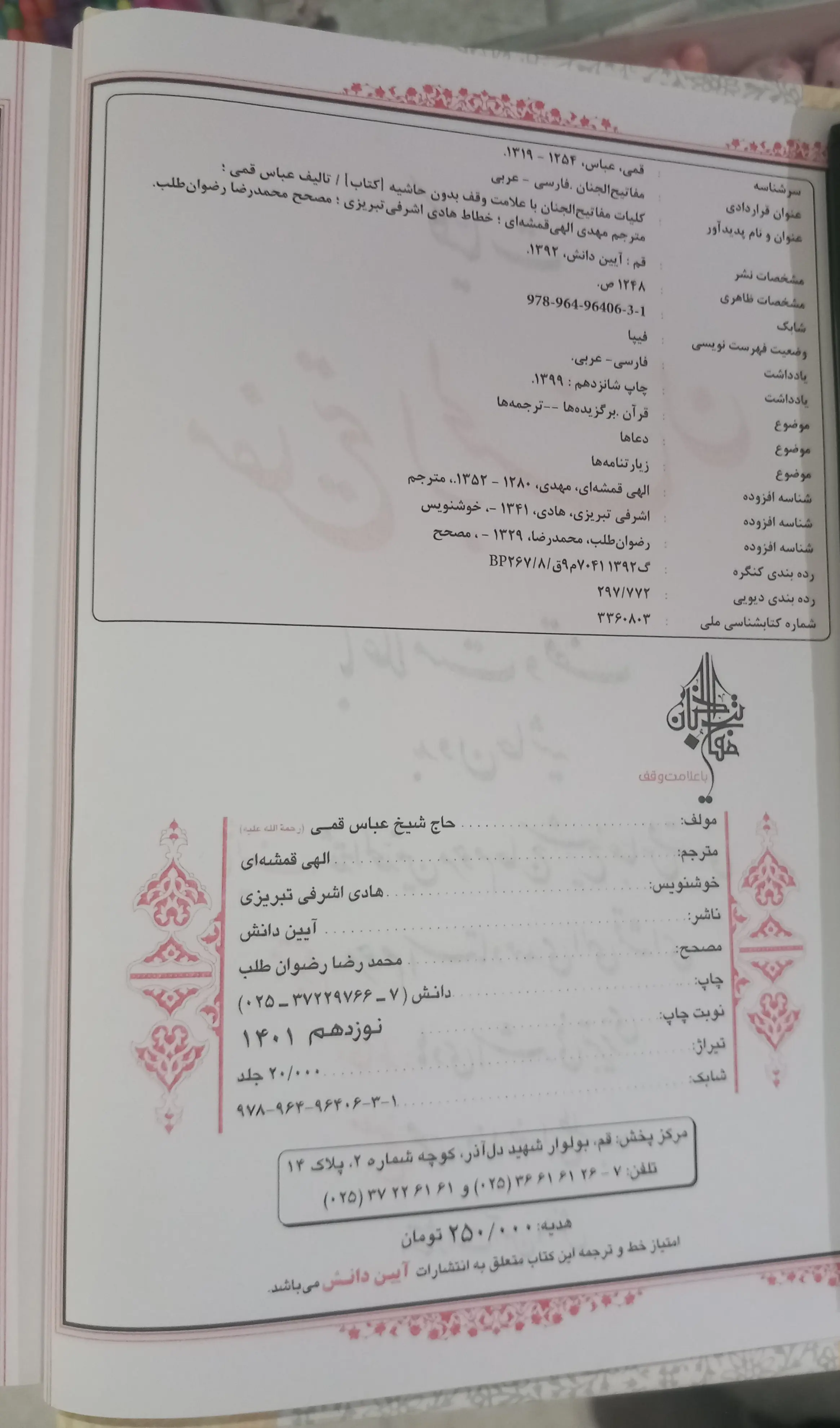 نویسنده:حاج شیخ عباس قمی مترجم:الهی قمشه ای خوشنویس:هادی اشرفی تبریزی انتشارات آیین دانش نوبت چاپ:نوزدهم سال چاپ1401 شابک:9789649640631